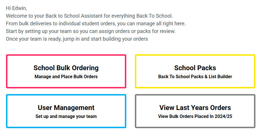 - Back to School Ordering – for building customised School Packs and place bulk orders in advance.