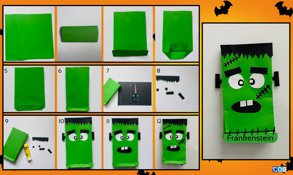 - For the face: While your paper bag is drying, cut out pieces for your Frankenstein: hair, eyebrows, mouth, teeth, and bolts.