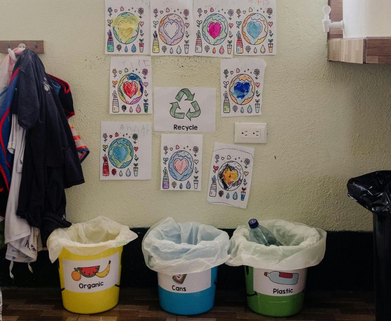 Consider a centralised waste management approach with colour-coded bins. Green-lidded bins for organic waste, yellow for recyclables, and red for general waste create visual cues even young students can follow.